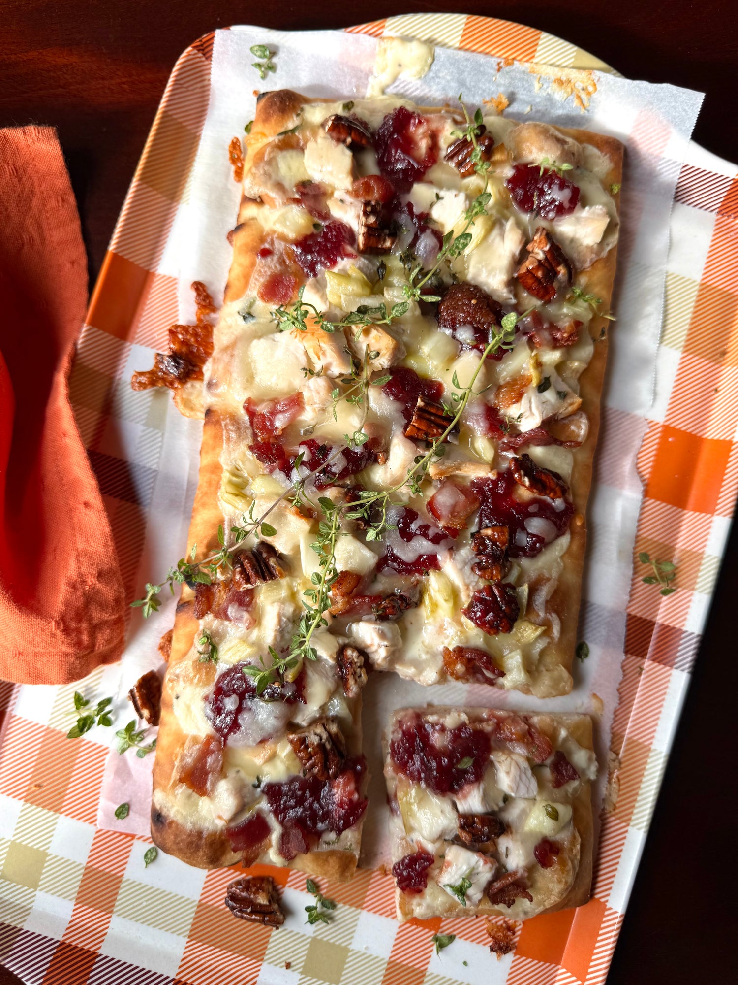 Meet the Gobble Gobble Pizza — where every slice is a second helping of your favorite holiday flavors! It starts with a crispy Brooklyn Bred crust, layered with creamy Alfredo sauce and topped with juicy turkey, crispy bacon, crunchy celery, and a swirl of tangy cranberry sauce. Throw in some candied pecans for a touch of sweetness and melty Monterey Jack cheese to bring it all home. Finished with a sprinkle of fresh thyme, it’s basically Thanksgiving dinner... but on a pizza. And yes, you’re allowed to eat it in sweatpants, no family drama required.