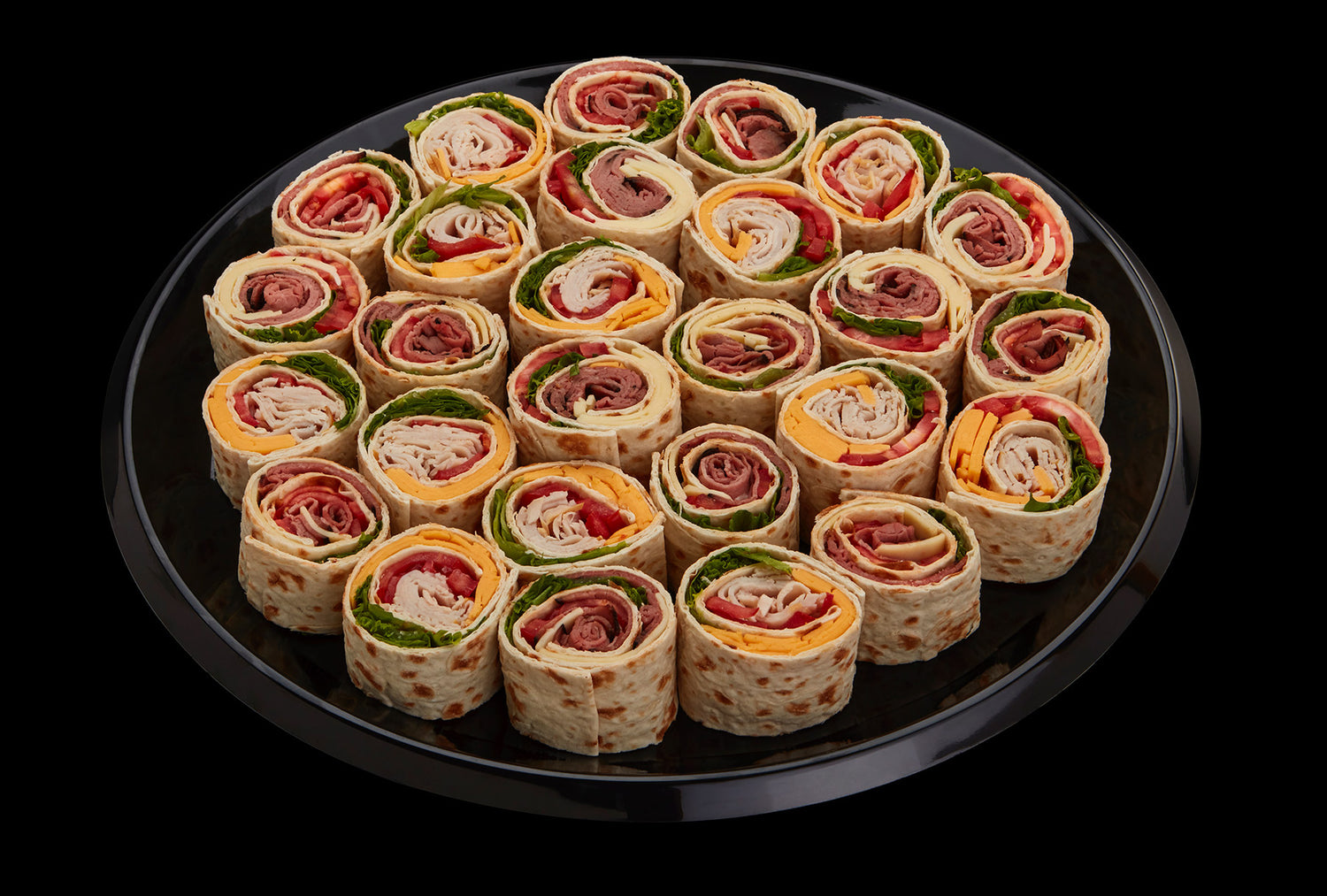 6. Cut a total of 6 pinwheels per lavash. Interchange meats, cheeses and sauces for a variety of roll-ups. Arrange on a party plater and serve.