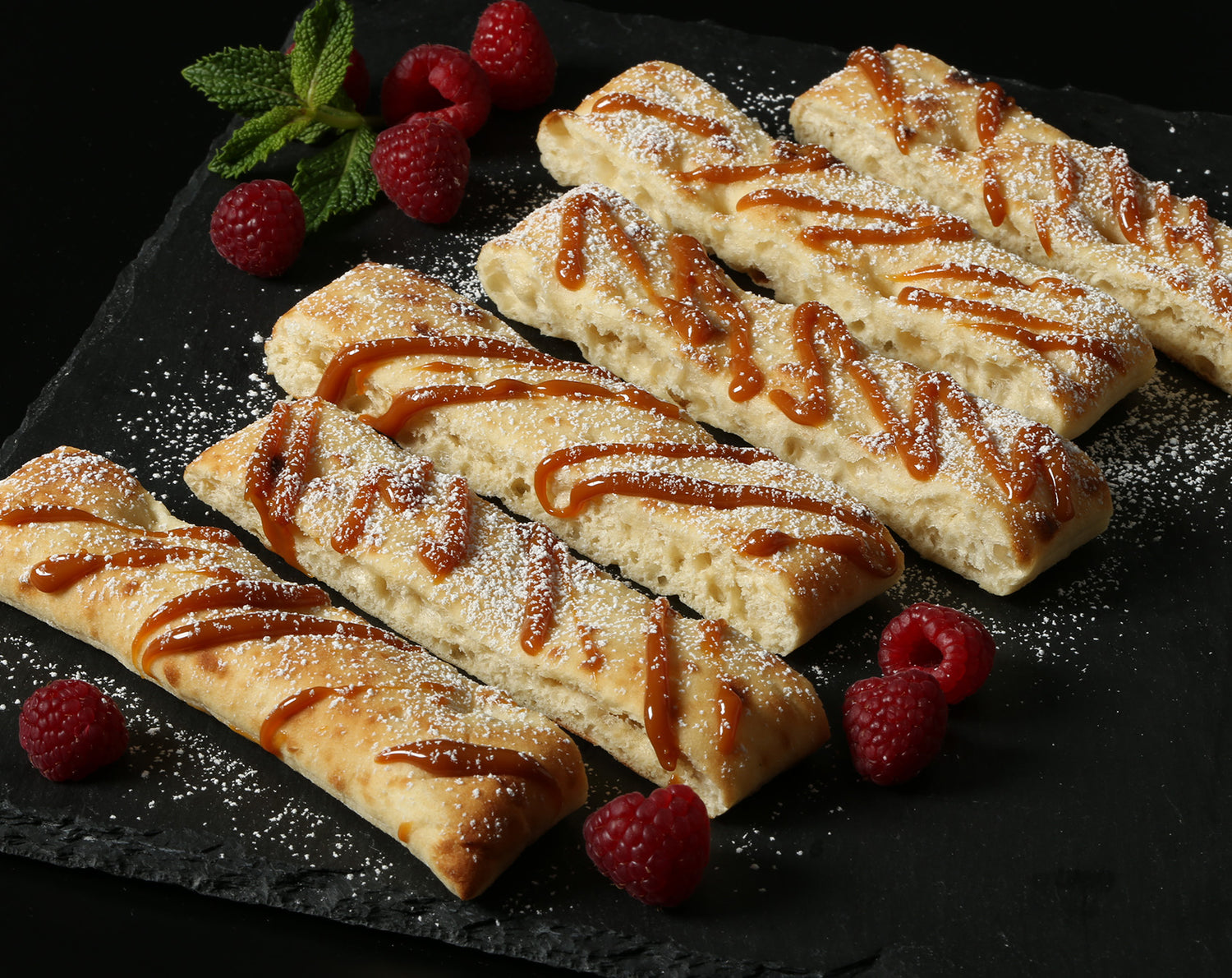 Drizzle each breadstick with caramel sauce and dust with powdered sugar. Serve.