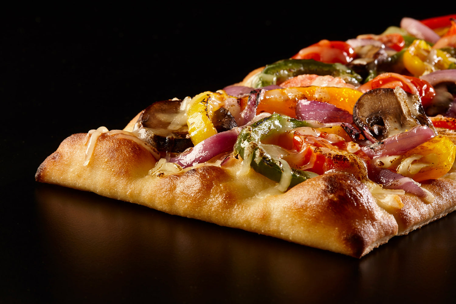 1. Top crust with oven roasted onions, red bell peppers, green bell peppers and mushrooms.
